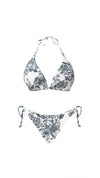 This reversible triangle bikini features a chic gold ring detail and tie-side Latin bottom, offering two stylish looks in one set, perfect for creating sexy vacation outfits.